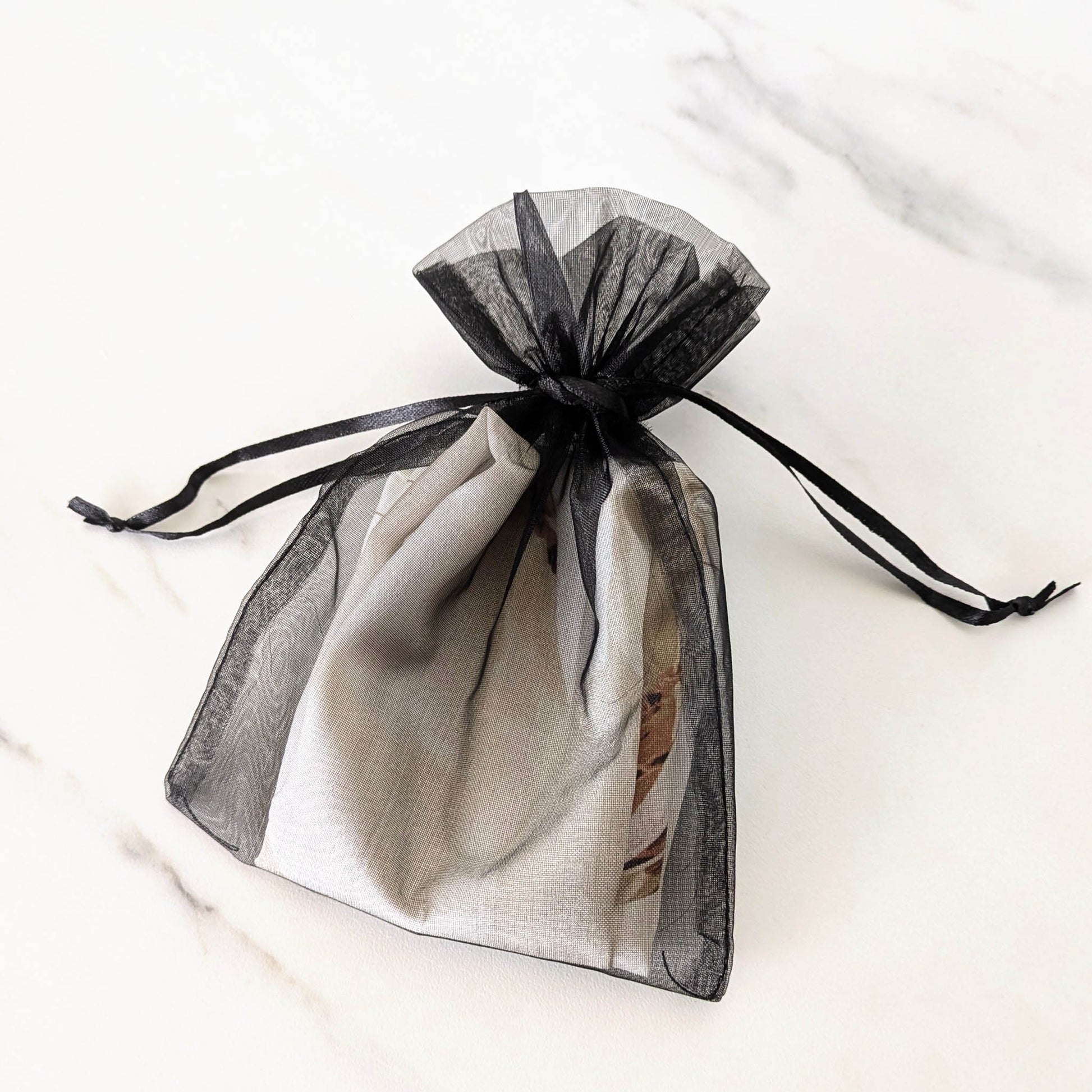 - Le foulard est livré dans un sac en organza noir.